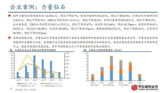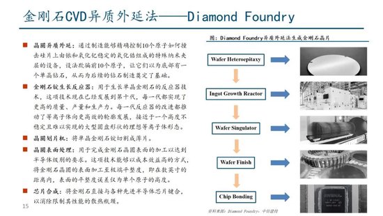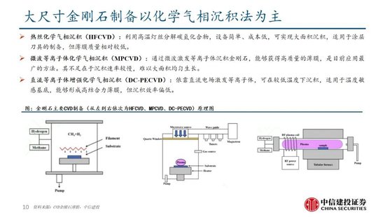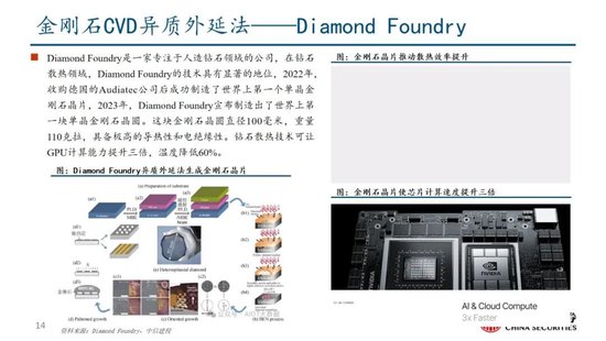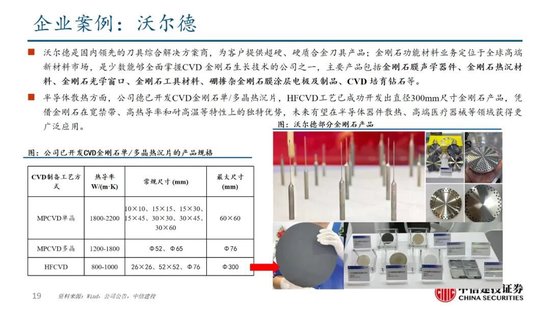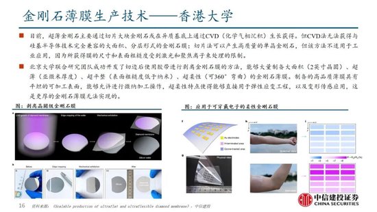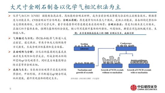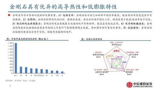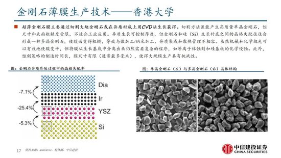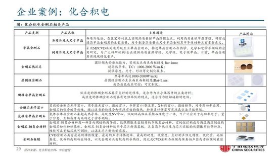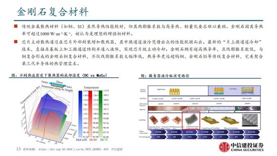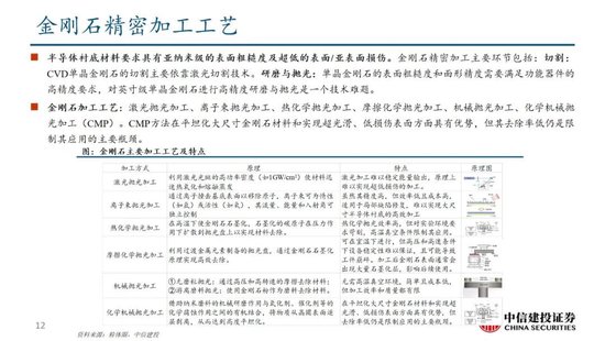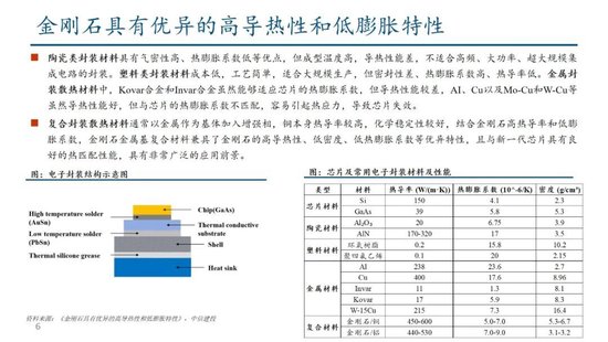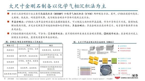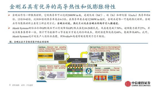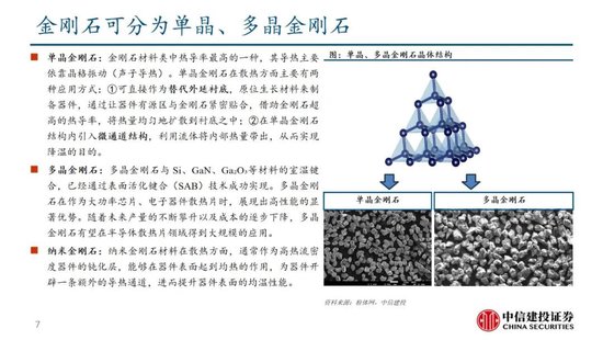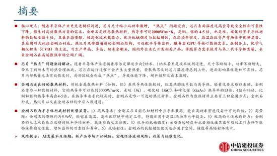 随着半导体产业更先进制程迈进,芯片尺寸缩小而功率激增,“热点” 问题突出,芯片表面温度过高会导致安全性和可靠性下降,催生对高效散热方案的需求。金刚石是理想散热材料,热导率可达2000W/m・K,是铜、银的 4-5 倍,也是硅、碳化硅等半导体材料的数倍至数十倍,且兼具高带隙、极高电流承载能力、优异机械强度与抗辐射性,在高功率密度、高温高压等严苛场景中优势显著。其应用形式包括金刚石衬底、热沉片及带微通道的金刚石结构,可适配半导体器件、服务器 GPU 等核心散热需求。在制备上,化学气相沉积法(CVD)为主流,可生产单晶、多晶、纳米金刚石,国内外企业已开发相关产品。伴随算力需求提升与第三代半导体发展,未来金刚石在高端散热市场空间广阔。