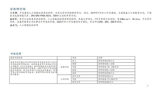 庞佳军:电子行业联席首席分析师、人工智能组联席首席分析师,东南大学硕士,7年半导体行业经验,曾在Marvell、Nvidia、平头哥半导体、乐鑫科技等公司从事芯片研发和管理,2022年加入中信建投电子团队,专注研究CPU、GPU、EDA等领域。