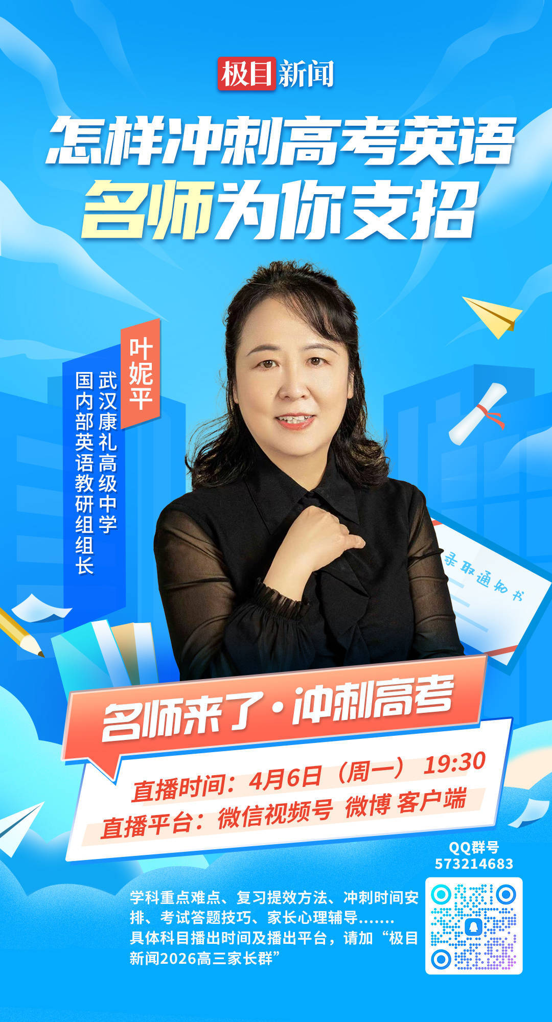 4月6日(周一)19:30,极目新闻“名师来了・冲刺高考”系列公益直播重磅来袭!本次特邀武汉康礼高级中学国内部英语教研组组长叶妮平老师做客直播间,为广大考生和家长带来英语冲刺复习攻略。