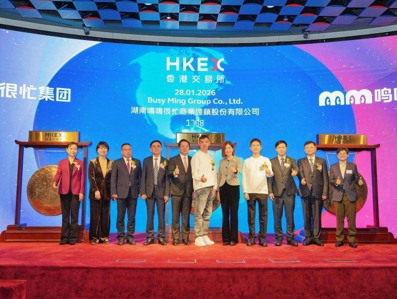 鸣鸣很忙在港交所挂牌上市。受访单位供图人民网长沙1月28日电 (记者林洛頫)今天,中国最大的休闲食品饮料连锁零售商——湖南鸣鸣很忙商业连锁股份有限公司(以下简称“鸣鸣很忙”)在香港联合交易所主板挂牌上市,证券简称为“鸣鸣很忙”,股份代号为1768.HK。